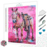 Découvrez ce DP au style très féminin, imprégné de nuances de rose, mettant en scène un cheval américain équipé de sa selle et de son harnais, attendant tranquillement sa cow-girl.